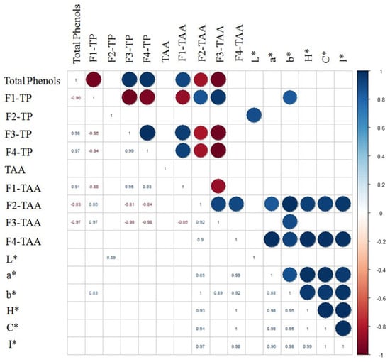 Polyphenol compounds are known due to their own antioxidant properties that generally are presumed to be linked to human health benefits []. Therefore, a correlation matrix using correlogram was conducted; Pearson’s correlation was carried out using phenolic compounds and antioxidant activity, and their fractions and color parameters, respectively.