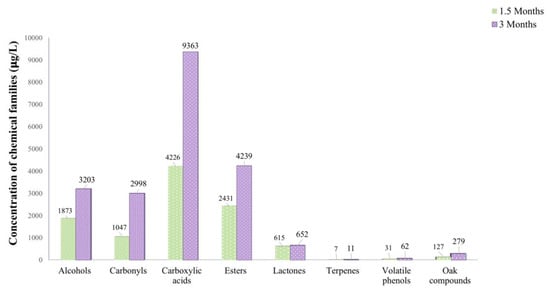 In Figure 2, the concentration of the chemical families for aged wines with oak staves at 1.5 and 3 months is represented. Wines aged for 1.5 months with oak staves present the highest concentration of carboxylic acids, esters, followed by alcohols and the lowest amount of terpenes. After 3 months of ageing, wines present similar behaviors, but with concentrations much higher than at 1.5 months. Additionally, all chemical families were characterized by the increases of concentrations at 3 months. Esters are generally produced during the alcoholic fermentation by the activity of yeasts and are known to influence on fruity and floral aromas in wines []. One more chemical family with a positive impact on the red wines were the oak compounds, due to these compounds being directly extracted from wood. Coconut, vanilla, and woody-like are the main characteristics for whiskey lactone [].