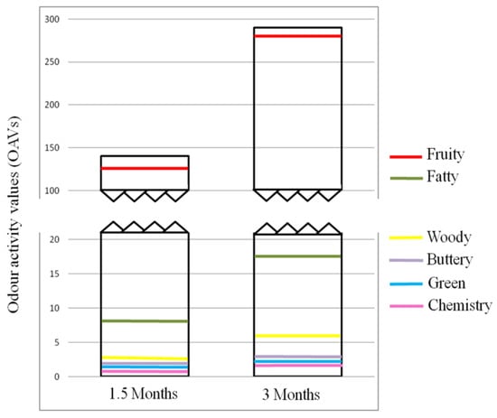 The aroma fingerprint for the ageing wine can be defined, from a quantitative point of view, as fruity, fatty, woody, buttery, green, chemistry, toasty, spicy, floral and citric fruits. A comparison of the OAVs for these series allows for a better understanding of the contribution levels of specific aroma compounds extracted during wines’ ageing with oak staves. Additionally, to compare the aroma specificity of wines aged for 1.5 months or 3 months, the OAVs were classified into the ten-aromatic series, describing the representing aroma of a particular wine. Figure 3 shows the aroma characteristics of the aged wine for 1.5 and 3 months, by arranging the mean values for the first six aromatic series from high to low. The results exhibit higher OAVs obtained during ageing, and especially for the fruity, fatty and woody series.