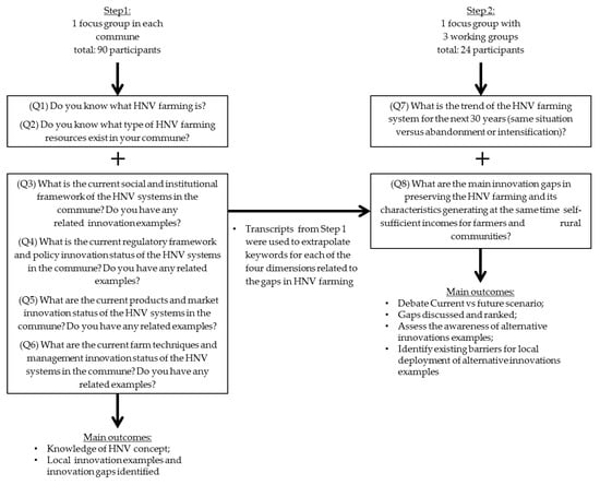 The data collection involved two steps. First, one FG meeting was organized in all eight communes (Apahida, Bonțida, Borșa, Chinteni, Dăbâca, Jucu, Panticeu and Vultureni) between January and May 2017. They involved 90 participants, including 70 farmers (the smallest group of eight participants was in Apahida commune and the biggest one with 12 people in Bonțida commune) (Step 1 in Figure 1). One of the key issues for the success of the FGs is to have sufficient diversity in the group to encourage discussions and at the same time not to be too heterogeneous such as to avoid conflicts [56]. Thus, in each commune, a multi-actor focus group was created. They were composed of NGO’s representatives, researchers, administration workers, local leaders (priests, educators, doctors), Local Action Group members, advisors, farmers, and farmers’ representatives. As suggested by Rabiee [45], the participants in the FGs were selected based on the principle that they had something to say regarding the HNV farming system in the region. A desk review using the on-line search engines was used to identify the stakeholders that are active at the local level. Farmers were identified based on data collected from the local town-halls. In each group, farmers represented at least one third of the group. Emails and phone invitations were sent to all selected participants communicating the discussion topic, the venue, and the hours for the meetings. Each meeting was conducted by a moderator who used open-ended questions arranged in a logical sequence in a predetermined interview guide. The questions were phrased such as to be easy to understand and logical to the participants as suggested by Barbour and Morgan [56]. Each discussion lasted on average for about two hours. At the beginning of the meetings, the moderator presented the main goals of the FGs followed by a presentation of all participants. The introduction into the subject was done with two initiation questions (Q1 and Q2 in Figure 1), followed by a clarification of the meaning of the HNV farming system and the HNV innovations to avoid the possible insecurity of the participants as suggested by Fischer and Young [57]. Following, four questions were discussed for a better understanding of the current innovations’ status in the territory and to identify possible HNV innovation gaps (Q3 to Q6 in Figure 1). The eight FGs meetings focused on understanding the feelings and the comments of the participants without necessary reaching a consensus. The main answers were recorded on a standard written sheet by one designated team member. Also, the sessions were sound recorded, and the transcripts were used afterwards to complete the in situ answers based on the text analysis.