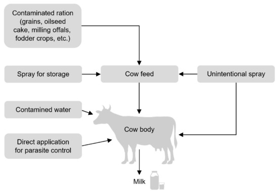 Possible sources of contamination of cow body and milk with pesticides [7].