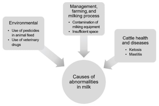 These udder infections can significantly increase the count of microorganisms in raw milk. The milk parameters already being monitored by the European Parliament and Council are somatic cell count (SCC) and total plate count of mesophilic microorganisms (TPC). Regarding consumer health, these milk parameters are monitored in the context of foodborne illness control [26]. The causes of abnormalities in milk are schematically illustrated in Figure 2.