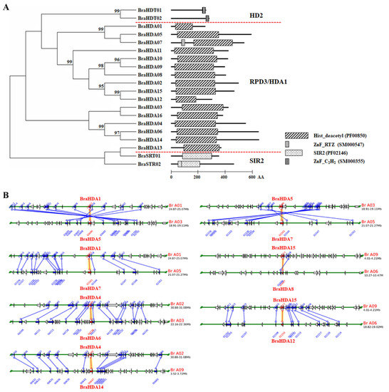 Phylogenetic tree, domain architectures (A) and synteny analysis (B) of the Brassica rapa HDAC family. Using the neighbor-joining method, phylogenetic tree was generated. The conserved domains in the putative BraHDACs were analyzed with the SMART program. Paralogous gene pairs were analyzed using plant genome duplication database.