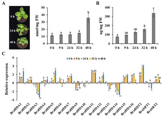 Physiological response to heat stress in Chinese cabbage. Changes in malondialdehyde (A) and proline (B) levels after exposure to heat stress (40 °C) were determined. (C) Expression patterns of Brassica rapa histone deacetylases (BraHDACs) in response to heat stress. Expression is indicated as a log2 ratio of experimental treatments relative to the values at 0 h. The bars represent the mean ± standard error across three independent experiments. Different letters indicate statistically significant differences (p < 0.05).