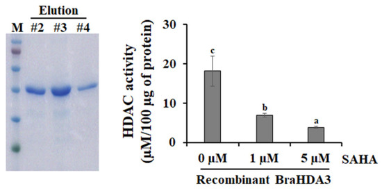 HDAC activity of recombinant BraHDA3. SDS-PAGE exhibited the purified recombinant BraHDA3 proteins. BraHDA3 enzyme activity was analyzed using HDAC Activity Colorimetric Assay Kit. Different letters indicate statistically significant differences (p < 0.05).