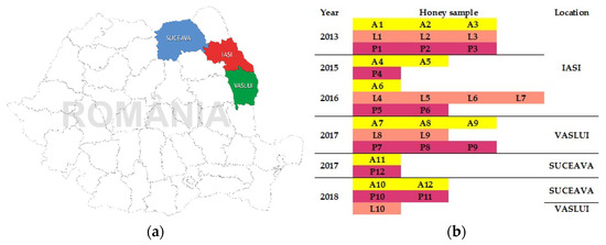 Thirty-four raw honey samples produced by Apis mellifera of three of the most known honey types: acacia (A) (twelve samples), linden (L) (ten samples) and multifloral (M) (twelve samples), were collected during 2013–2018 directly from beekeepers. The honey produced in eastern Romania comes from different sites of Iasi, Vaslui and Suceava counties (Figure 1a,b). The collection of honey samples was carried on throughout different years, from 2013 to 2018, during the period of maximum flowering of melliferous plants (acacia and linden). Raw honey samples were kept in glass jars, preserved at room temperature (20 ± 3 °C), away from light. The analyses were performed within a maximum of 2 weeks from the arrival of the samples to avoid their degradation as well as the modification of their parameters, taking into account the fact that they were raw honey samples and not commercial honey. The analyses were performed in triplicate. The crystallized raw honey samples were liquefied at 40 °C in a water bath (manufacturer: Memmert GMBH – Schwabach, Germany). Homogenized samples were filtered through a double-layered gauze to retain the biggest impurities prior to the analysis.