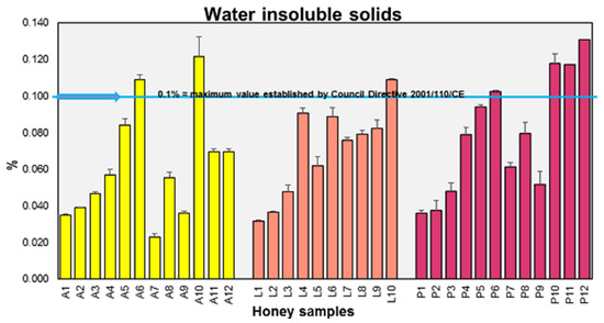 Studies made on Libyan honey, honey from the Czech Republic market and on honey collected from the western part of Turkey showed a content of water-insoluble solids under 0.1% [22,24,25,26]. High values of this parameter were found in honey samples from Brazil of 0.27–0.95% [27].