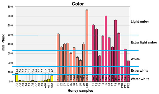 Honey pigmentation was variable, ranging from white to a light tint of amber. The lowest Pfund value was 0.3 mm Pfund in acacia honey (A7 sample) and the highest Pfund value was 76.4 mm Pfund in linden honey, sample L10. In Figure 3, it is observed that the linden and multifloral honey samples have different color shades, for p < 0.05. Statistically, there was a significant difference in mm Pfund means between the two types of honey: acacia and linden, and acacia and multifloral.