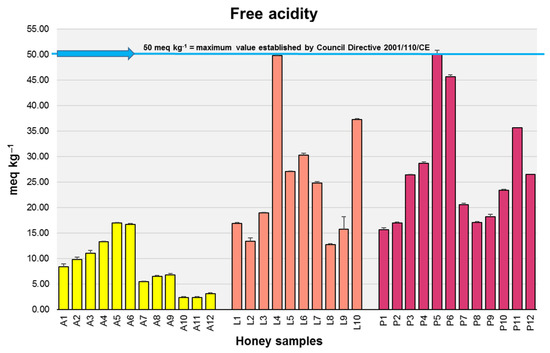 Honey is an acid food. Acidity is influenced by chemical properties of the organic and inorganic acids. Further, the action of glucose oxidase could induce alterations of honey acidity via gluconic acid accumulation [19]. Moreover, other biochemical species, such as lactones, esters and even inorganic acids, could influence the concentration of lactic acid in honey, influencing thus its free acidity level [32]. This parameter is important because its value is a measure of honey freshness. All of the free acidity values from the investigated honey samples were lower than 50 milliequivalents acid per 1000g, the maximum allowed value specified by the legislation (European Commission, 2002). The lowest free acidity was obtained in an acacia sample (A10 sample). Figure 5 reveals the lowest values of acacia samples, between 2.4 and 17.0 meq kg−1. The highest value of 27.1 meq kg−1 was measured in multifloral honey, and then intermediate acidity was observed in linden samples (24.7 meq kg−1). In other studies, free acidity values were close to our findings: 21.6 meq kg−1 in Slovakian linden honey [55], 7.8–29.6 meq kg−1 in Serbian acacia honey [56] and 28.62–39.75 meq kg−1 in multifloral Portuguese honey [56].