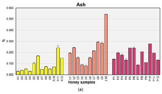 Assessment of ash content in honey samples was carried out by the calcination method (550 °C) in the Nabertherm B180 furnace (manufacturer: Nabertherm GMBH, Lilienthal, Germany); the results were expressed in g/100 g [10,20,21].
