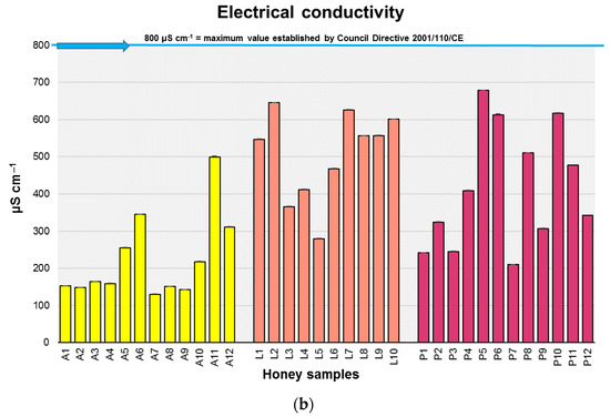 A variability of values of this parameter was observed within the same type of honey: in acacia, values ranged from 130 to 500 μS cm−1, and in linden between 279 and 646 μS cm−1, while in multifloral honey, the values were measured between 210 and 679 μS cm−1. Pretty similar dynamics of values were reported in Romanian samples: between 202 and 730 μS cm−1 in linden honey [5,43,44,45,58]; between 97 and 350 μS cm−1 in acacia [5,43,45,49,58]; and between 232 and 831 μS cm−1 in multifloral honey [32,39,45].