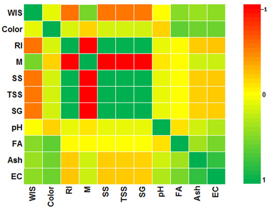 A positive strong correlation between ash and electrical conductivity (r = 0.81) was found; refractive index was strongly positively correlated with three parameters: specific gravity (r = 0.99), total soluble substances (r = 1), solid substances (r = 1); solid substances had a strong positive correlation with two parameters: total soluble substances (r = 1) and specific gravity (r = 1), while total soluble substances had a strong positive correlation with specific gravity (r = 1).
