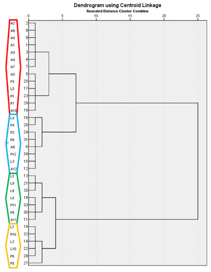 The dendrogram (Figure 9) reveals the formation of four clusters in which we found honey samples with similar characteristics.