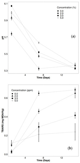 Considering the interaction between CCP concentration and time, pH decreases (p < 0.05) were observed from the first day until the end of the experiment for all treatments, while the CCP addition caused lipid oxidation declines, resulting in the lowest TBARS concentrations in samples containing 5.0% CCP. A progressive lipid oxidation inhibition as a function of increasing CCP concentrations was also observed (Figure 1).