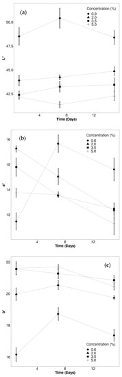 Colors, L* (a), a* (b), b* (c) of vacuum-packed ground beef containing different camu-camu powder levels stored at 5 °C.
