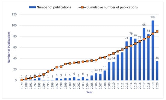 The cumulative number of publications followed an upward trend. It could be divided into three phases according to the speed of the increase. The first phase spanned from 1979 till 1998. The second one, which had a lower speed than the first phase, covers the period from 1999 to 2007. The last phase, which had the highest speed of increase, started from 2008 to 2020.