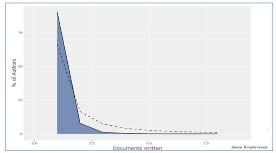 Lotka’s law indicates author productivity []. It exhibits the relationship between the author and the publication numbers. The general form of Lotka’s law is X n= where X is the number of publications, Y is the number of authors who published X publications, and n and C are constant. Using the function in R studio language, L = lotka (results), n = 3.626, C = 0.778, R2 = 0.975 and p-value is 0.056. C = 0.778 is the percentage of the total author number, which is equal to 1996.