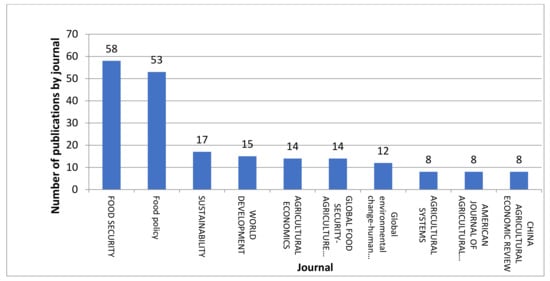 As displayed in Figure 3, there are two most relevant and top-ranked sources. The first source is the journal of food security, which is in first place with the highest number of publications (58 articles), followed by the food policy journal (53 articles). Both journals are Q1 ranked. The sustainability journal occupies third place with 17 articles.