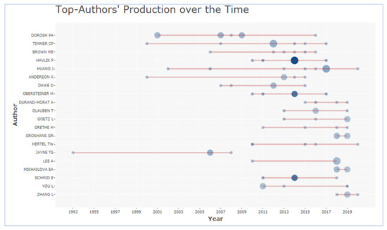 Figure 4 and Table 6 highlight the most productive authors over time. The most productive authors are those who have contributed the maximum to the field. Based on Jorge Hirsch, who suggested the h-index in 2005, it means that each author has at least "h" citations of the published papers [].