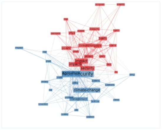 As highlighted in Figure 5, food security occupies the network hub, presented by the biggest rectangle. The keyword “Agriculture” is superposed on “food security”, reflecting the closeness between them, in other words, we cannot separate agriculture from food security.