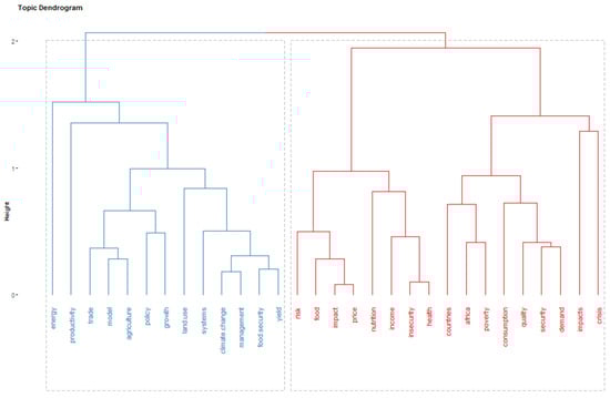 The dendrogram of keywords approves what is presented in the keyword co-occurrence. Two clusters are identified. For the blue group, food security is linked to production and policies. For the red cluster, the word insecurity is related to quality, health, and income. Future research focuses on the production, household income, and access to healthy food, which affords them the necessary nutritive needed value to protect their health status.