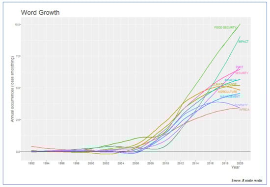 As highlighted in Figure 7, the food security field is noticeably increasing over the years. This means that it is always the core interest of many researchers. The food security composite keywords are joined with the word "price" and "impact", which also rise with an important speed. This signifies the growing interest in research in this field.