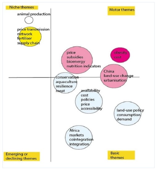 The basic themes in the first period (Figure 9) were the supply of a rapidly developing population with rice and stabilization. Other important basic topics were the set of costs—price relationships, access, and availability. The application of cointegration has been on the border between basic and motor themes. The most important emerging topics in this period were the effects of climate change on hunger, health, and the environment. Interestingly, the studies analyzing the problems in Africa were rather peripheral ones.