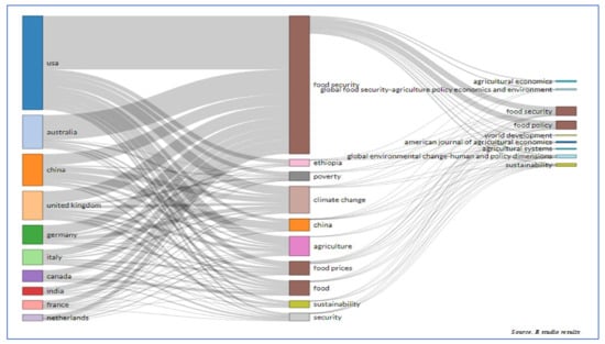 This shows the relations between the countries, the principal authors’ keywords, and sources. This diagram demonstrated which countries treat the food security and food price change of publications, the core author keywords used in these publications, and the sources they have published. As presented in the figure, the USA headed the country list, which focuses on food security as a keyword; their publications are mainly in food security and food policy journals. Climate change was the second important keyword used mainly by American authors.