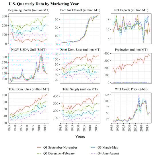Data for the analysis in this paper come almost entirely from the United States Department of Agriculture (USDA) Feed Grains Database which records statistics on four domestic feed grains (corn, grain sorghum, barley and oats), foreign coarse grains (feed grains plus rye, millet, and mixed grains), hay, and related items []. Available data include supply, demand and prices, among other variables, but the frequency and period spanned by the data (month, quarter or annual) vary across commodities. The data used for the analysis in this paper spans the period from MY 1986:Q1 to MY 2017:Q1 for which complete data for all variables are available; a total of 125 quarterly periods. In addition to corn market variables, average crude oil prices, specifically the West Texas Intermediate (WTI) price, were calculated for each MY quarter using data on monthly spot prices from the U.S. Energy Information Administration []. The US corn market variables extracted from the Feed Grains Database are shown in Figure 1, and described below: