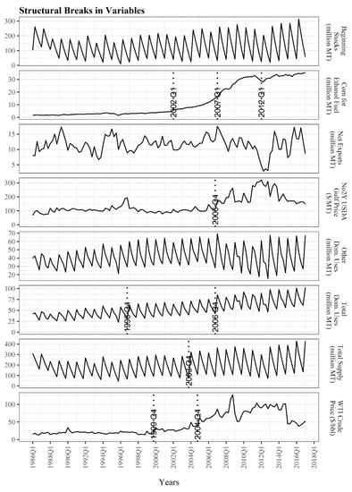 All eight variables examined in this paper, except beginning stocks and other domestic corn use, contain at least one structural break in the mean during the MY 1986 to MY 2017 period. The three breaks in corn use for ethanol are in MY 2002, 2007 and 2012. The break-date in the fall of 2002 (MY 2002:Q1) precedes the 2005 RFS1 legislation but falls within the period of public discussions and planning leading up to its enactment. A Blue Ribbon advisory panel of the U.S. Environmental Protection Agency (EPA) called for reductions in MTBE use in 1999 due to its contamination of drinking water []. MTBE (methyl tertiary-butyl ether) is a flammable, colorless liquid that dissolves easily in water. It is part of a group of chemicals known as fuel oxygenates that are added to increase gasoline’s oxygen content. California led the way with legislation to eliminate MTBE as an oxygenate in gasoline supplies by December 2002 []. In addition, a proposal to eliminate MTBE from all U.S. gasoline was introduced but not passed by the U.S. Senate in 2001 []. In response to state bans and potential liability concerns, large fuel producers, such as BP and Exxon, announced plans to eliminate MTBE from their gasoline production by early 2003. Consequently, U.S. ethanol production grew by 21% in 2002 marking a period of double-digit annual growth that lasted until 2010. Thus, the MY 2002:Q1 break in corn use for ethanol identified in this study marks the shift to ethanol initiated by state-level laws on MTBE that by 2005 included more than 20 states [,].