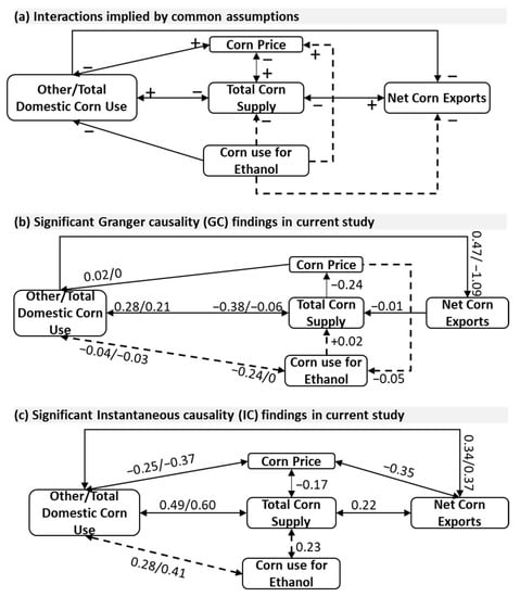 Interactions among corn market variables based on common assumptions (panel a) versus Granger (panel b) and Instantaneous (panel c) causality results in the current study. Relationships among corn use for ethanol and other variables are emphasized by dashed lines Note that Other and Total domestic corn use are combined in this figure for clarity.