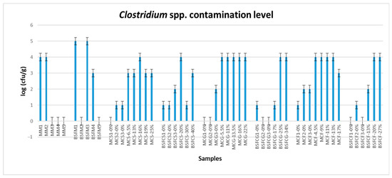 A significant level of Clostridia and other microbiological contaminants in insect products was also observed by Garofalo et al. [16] They conducted experiments on different batches of eligible insect products marketed in the European Union and purchased from a company located in the Netherlands. These products contained powdered and whole mealworm larvae (Tenebrio molitor), small crickets (Acheta domesticus), and locusts (Locusta migratoria). They noticed the occurrence of Enterobacteriaceae, Clostridium spp., and C. perfringens species in all the analyzed samples at the level of <2 log(cfu/g).