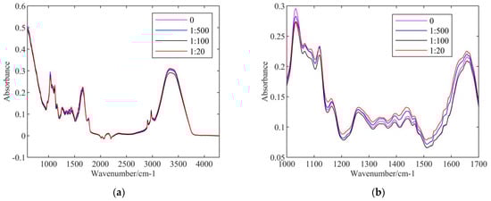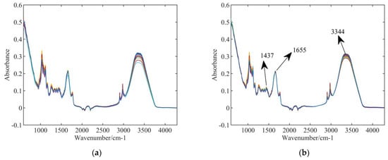 Figure 2a,b show the spectra of samples in the first group (samples without pesticide) without and with MSC processing method. Compared to the raw spectra, the within-class variance was decreased, especially at the locations of the absorption peaks (1437 cm−1, 1655 cm−1, 3344 cm−1, etc.). This improves the recognition rate of the spectra.