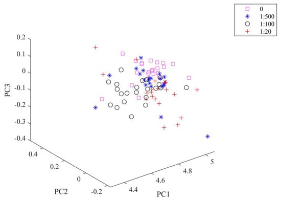 Top three principle components (PCs) for training set samples with no pesticide contamination, mild contamination (pesticide water ratio 1:500), moderate contamination (pesticide water ratio 1:100), and severe contamination (pesticide water ratio 1:20).