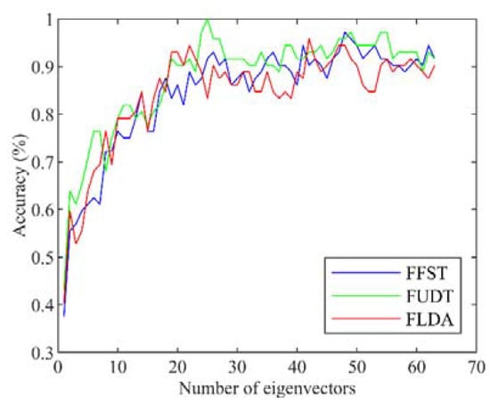Figure 5 illustrates the performance of FFST, FUDT, and FLDA combined with kNN on the test set. Although the lines fluctuate, the graph shows that the accuracy rates keep rising rapidly before reaching a plateau. This can be explained by the principle of PCA. Since several eigenvectors associated with bigger eigenvalues make a higher contribution, and usually the space formed by such eigenvectors can represent the data very well, those computed from smaller eigenvalues are meaningless and have low influence on the results of classification. Thus, the figure implies that only the first 30 eigenvectors are meaningful in the enumeration process.
