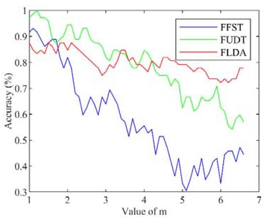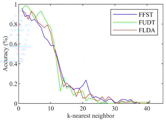 When it comes to the influence of m and k on the results, the accuracy rates decrease when m and k increase. Figure 6 demonstrates how the classification accuracy rates change with the rise of the value of m. All three feature extraction algorithms perform the best when the value of m nears 1. The accuracy rates using FUDT and FLDA decline relatively slowly as m increases. However, the accuracy rates of FFST fall sharply after the value of m reaches 3. Figure 7 illustrates the changing trend of classification accuracy rates when k differs. Different from the results shown in Figure 6, the accuracy rates of the three algorithms change similarly, and their accuracy drops quickly after k reaches 9.
