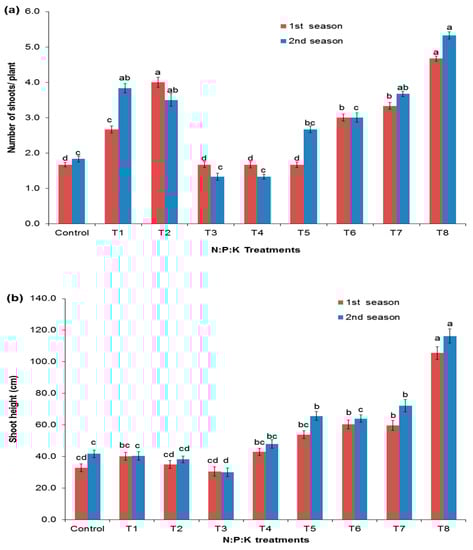 Data were collected at the end of the experiment in both seasons. Five plants were collected from each replicate to inspect the effect of the treatments on the vegetative parameters. For each plant, we collected data on shoot height (cm), the number of shoots, the number of leaves, the fresh weight of the green parts (g/plant), and the dry weight of the green parts (g/plant). After the removal of the plants, the roots were cleaned from the soil with tap water and dried with paper tissues, and the length of the roots (cm), the fresh weight of the roots (g/plant), and the dry weight of the roots (g/plant) were measured.