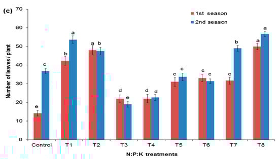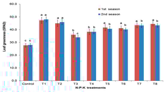 Figure 4 shows that the leaf greenness was significantly affected by NPK doses. The NPK application rates of T1 (4:2:2) and T2 (6:3:3) in the first season (47.3 and 45.0) and in the second season (48.0 and 45.9), respectively, had the highest greenness values. In contrast, the control had the lowest greenness values (27.7 and 28.0 for the first and second seasons, respectively).
