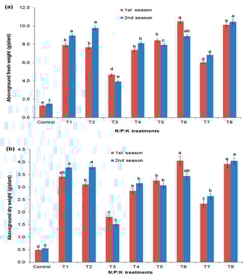 Effect of NPK treatments on the fresh (a) and dry weight (b) of the aboveground parts of Salvadora persica. Dissimilar letters designate the significance among means (p < 0.05) using Duncan’s multiple range test (means ± standard errors (n = 5)) for the different fertilization treatments.