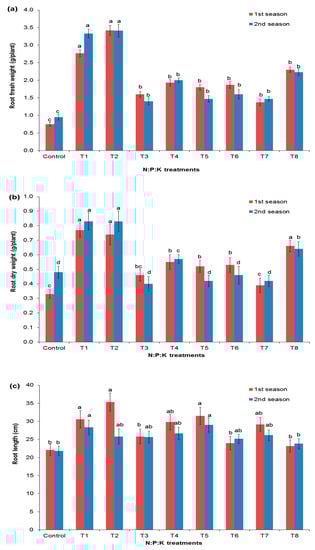 Effect of NPK doses on the root fresh weights (a), the root dry weights (b), and the root lengths (c) of Salvadora persica. Dissimilar letters designate the significance among means (p < 0.05) using Duncan’s multiple range test (means ± standard errors (n = 5)) for the different fertilization treatments.