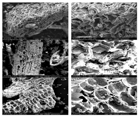 The BC specific surface area (reactive surface area per unit weight of soil) was 9 m2 g−1. The BC morphology was diverse due to it being a mixture of three different biochars—sawdust of mixed woods, elephant grass, and sugar cane leaves (Figure 1). Total porosity was 0.0112 cm−3 g−1 with an average pore size of approximately 200 μm. The particle surface texture was irregular, with micropores (<20 A) accounting for 87% of the total porosity, while mesopores (between 20 to 500 Å) were 13%. Macropores were lacking.