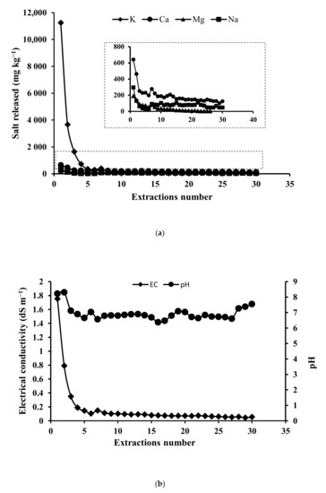 These properties are related to the BC’s capacity to sorb nutrients and to serve as microsites for soil microorganisms [30]. In addition, slow P adsorption increased with specific surface area, micro and meso-porosity, and ferrihydrite impurities [31]. BC functional surface groups with the potential to influence sorption reactions were composed of phenolics (80%), carboxylics (17%), and lactones (3%). Cumulative water extractable Ca, Mg, K, and Na totaled 5835, 1014, 19,713, and 5.835 mg kg−1 (Figure 2a), and dissolved organic Carbon (DOC) equaled 23.9 g kg−1. BC was 62% ash with a pH of 9.8. The initial high electrical conductivity of the BC rapidly decreased as it was sequentially leached with water, while the BC pH remained relatively high after an initial decrease (Figure 2b).