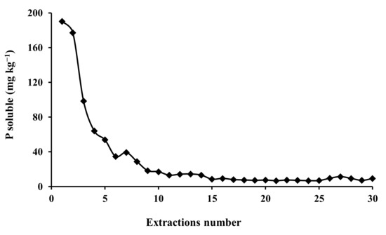 Chemical reactions naturally tend towards equilibrium; the same is true for the P in soil and P in SBC system. This happens when the reaction rate between Pi and soil exceeds the reaction rate between soil and Pi, becoming equal, reaching the equilibrium condition [39]. For the P in soil, the equilibrium condition was reached at 12 h and for the P in the SBC system at 48 h (Figure 5a).