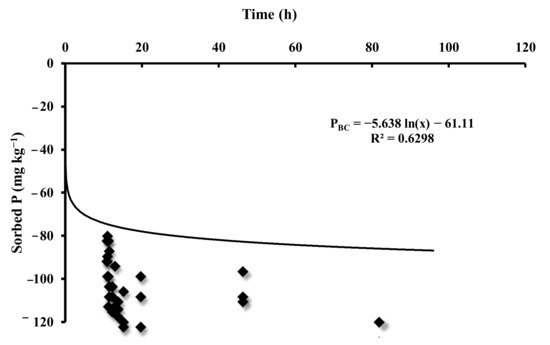 Sorption has been described as a two-step mechanism: (i) Moieties in an SBC system sorb to external surface sites and rapidly balance with the surrounding solution [41,42]; (ii) then these moieties slowly diffuse to interior sites [43]. In other words, the effect of adding BC to soil should be to decrease the affinity of P to the soil’s Fe-oxides and increase soil solution concentrations, thus enhancing P bioavailability [18].