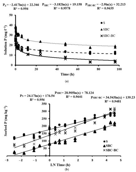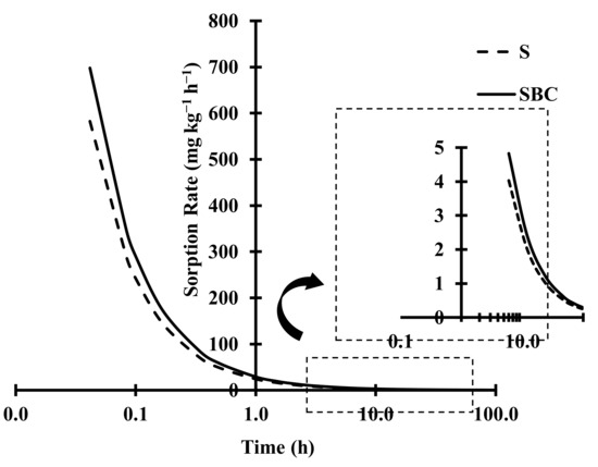 Phosphorus sorption in both cases, S and SBC, had a relatively fast initial reaction that took place between the initial 0 to 30 min for SBC, 0 to 1 h to SBC minus BC (SBC−BC), and 0 to 1.5 h to S. This was followed by a slower sorption reaction (Figure 5b). Probably because P is initially sorbed onto charged external surfaces of soil system during the period of fast P sorption and then diffuses into the BC particles, where slow and constant sorption takes place.