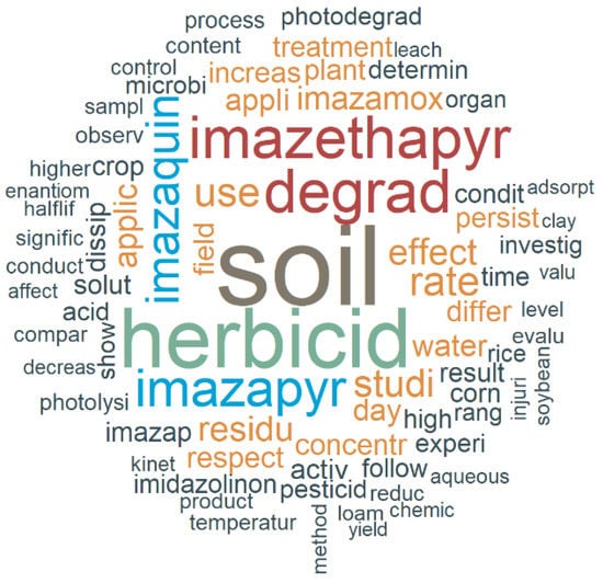 The word cloud of the selected records, which was prepared with the LDA topic model (Figure 2), showed that the terms soil, “herbicid”, “degrad”, imazethapyr, imazapyr, and imazaquin were the most frequently used in the selection. Their relative frequency in the records is shown as differences in their size and color in the word cloud. These terms’ frequency demonstrates that the selection of abstracts included collecting data relevant to the processes underlying imidazolinone soil degradation processes and the factors involved in herbicide degradation (smaller, gray terms in the word cloud).