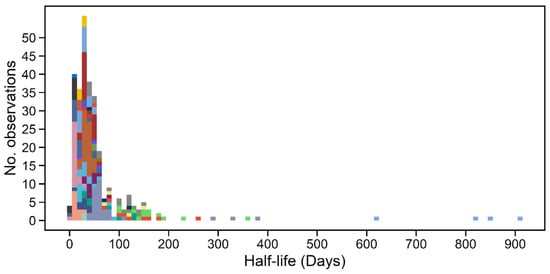Histogram of the distribution of the imidazolinone half-life values in the selected search records. Each record’s values by assigning a color palette to the selected records employed throughout this study which was included on Supplementary Figure S3.