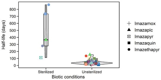 Records were therefore grouped on whether they measured the half-life in sterile or non-sterilized soils. The results in Figure 4 show a considerably longer half-life under sterile conditions, underscoring the leading role of biotic processes in imidazolinone degradation [25,26,27]. Imidazolinone herbicide can be degraded by abiotic means as well, as these herbicides are sensitive to photodegradation in water, depending on its turbidity and soluble organic matter content (indirect photolysis) [29,30,31]. However, photodegradation in the soil is limited to the topsoil (0.2–0.7 mm) and is restricted to less soluble compounds such as imazethapyr and imazaquin, as the others tend to move more easily to deeper layers of the soil [30,32,33].