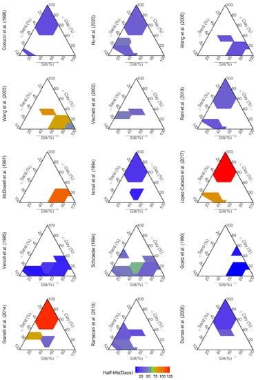 To understand the effect of soil texture on the half-life of imidazolinones, only the half-life values reported in works that evaluated different soil types were examined to isolate the other variables. The values examined were plotted on ternary plots allocating their respective texture classifications to the USDA soil texture triangle (Figure 5). Figure 5 indicates the soil trend with a higher clay content to degrade imidazolinones at a slower rate [37,38,39] due to the herbicide sorption to the soil clay constituents, especially iron oxides [34,40].