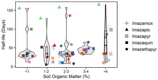 In addition to soil texture, the organic matter content can also determine herbicide availability [42]. However, there is no specific relationship between the organic matter content and imidazolinone degradation based on this dataset, as shown in Figure 6. Since a higher organic matter content tends to favor microbiological activity in the soil, Wang, et al. [43] evaluated its effect by incorporating 10% cattle manure into the soil, which reduced the half-life of imazaquin from 21 to nine days.